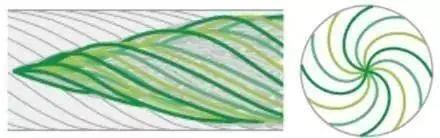 渦流紗是一種雙重結構紗,具有芯纖維和外包纖維,紗條的芯纖維平行排列、無捻度,外包纖維呈規(guī)則螺旋包纏在紗芯表面,這是由于其獨特成紗原理形成的。