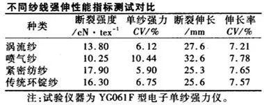 渦流紗單紗斷裂強度較緊密紡紗和傳統(tǒng)環(huán)錠紗低,但比噴氣紗高,且單紗強力不勻率較低,斷裂伸長較噴氣紗低,但比傳統(tǒng)環(huán)錠紗和緊密紡紗高,且斷裂伸長不勻率最好。